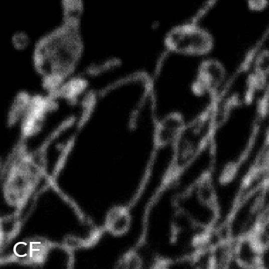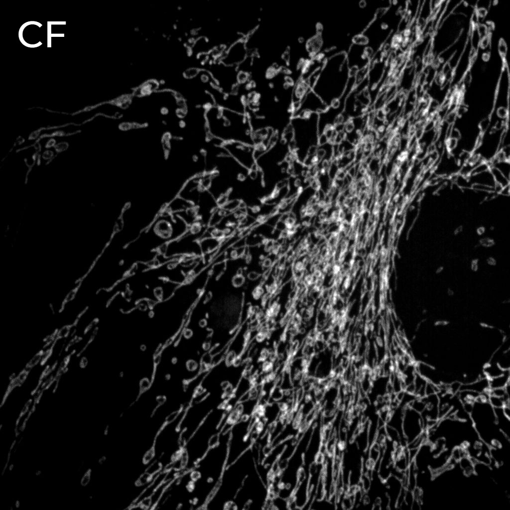 通过去除离焦和散射光,CF 成像可以提供关于 WF 模态的高质量图像;然而,为了观察折射率以下的生物细节,则需要 SR 技术。将 DeepSIM 提供的图像质量改善与对 CF 图像应用去卷积时实现的图像质量改进比较,因为已经证明其可改善线粒体结构检测(图 4)。