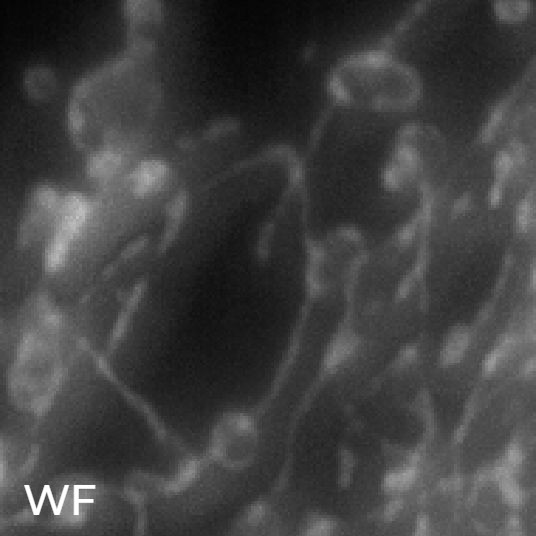 在图 1 中,我们比较了宽视野 (WF)、共焦 (CF) 和 SR 图像,证明在三种成像模式之间分辨率在显著提高。