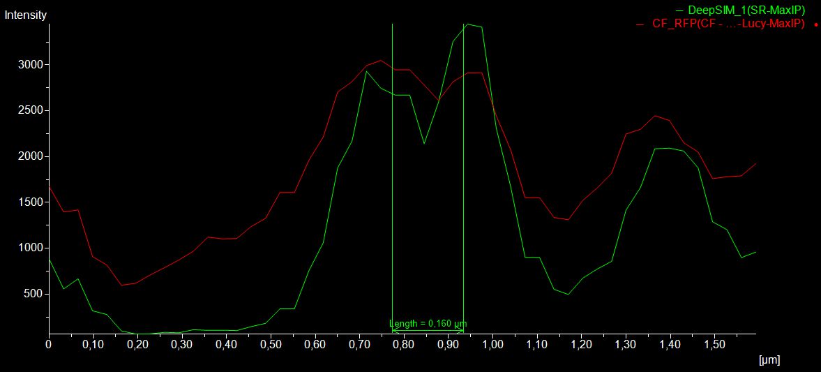 图 4:显示线粒体结构的去卷积 CF 和 SR 数据之间的平行比较。对线粒体间的接触 (A) 和相关的强度分布 (B)(红线和绿线分别代表去卷积 CF 和 DeepSIM 的强度分布)进行了显示。CF 图像的去卷积由 NIS Elements 软件提供的 3D Richardson-Lucy 算法执行。这些图像使用 CrestOptics X-Light-V3 CF 旋转盘系统结合 DeepSIM X-Light SR 系统并配置 CFI Plan Apo Lambda 100X 倍油浸物镜获取。