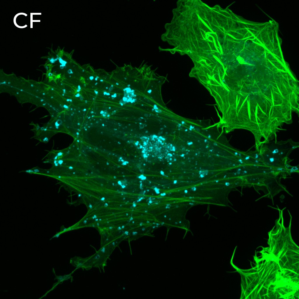 图 1:永久表达肌动蛋白(绿色)和核内体(青色)标记物的细胞的 WF、CF 旋转盘和 DeepSIM SR 图像的比较。这些图像使用 CrestOptics X-Light-V3 CF 旋转盘系统结合 DeepSIM X-Light SR 系统并配置 CFI SR Plan Apo IR 60 倍水浸物镜获取。