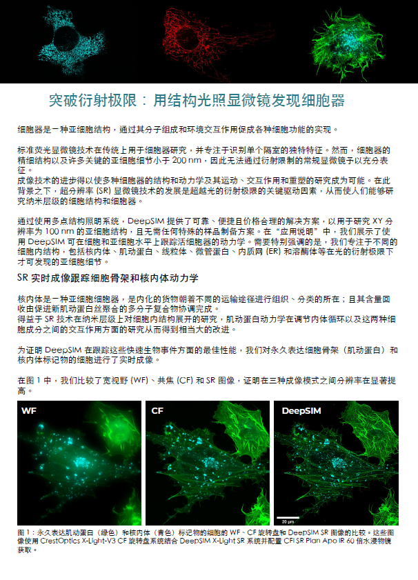 通过使用多点结构照明系统,DeepSIM 提供了可靠、便捷且价格合理的解决方案,以用于研究 XY 分辨率为 100 nm 的亚细胞结构,且无需任何特殊的样品制备方案。在“应用说明”中,我们展示了使用 DeepSIM 可在细胞和亚细胞水平上跟踪活细胞器的动力学。需要特别强调的是,我们专注于不同的细胞内结构,包括核内体、肌动蛋白、线粒体、微管蛋白、内质网 (ER) 和溶酶体等在光的衍射极限下才可发现的亚细胞细节。