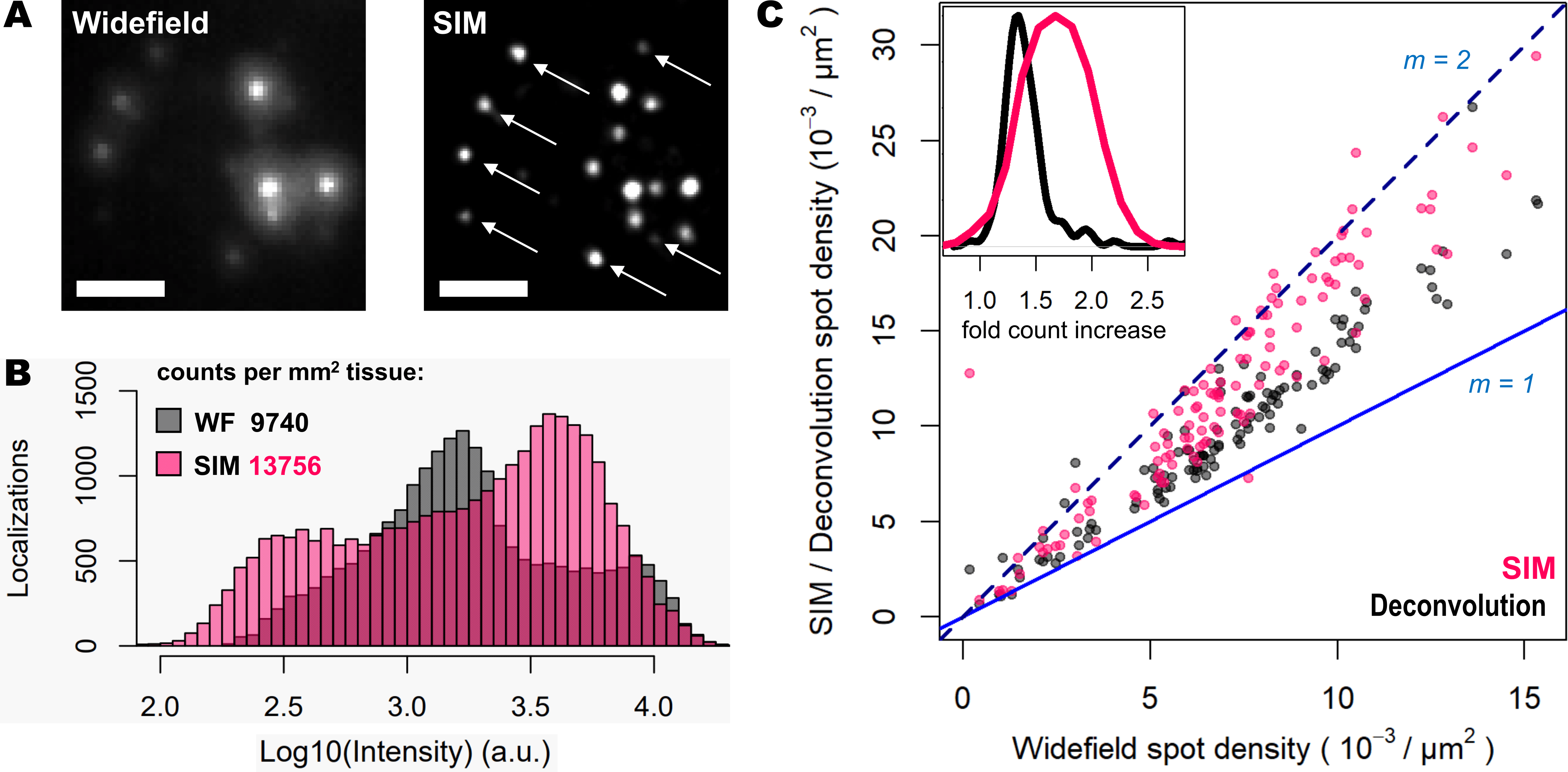 图 2: SIM 提高了斑点检测性能,并改善了斑点量化。 (A) 单个转录物的 WF 和 SIM 比较;白色箭头表示先前未检测到的超分辨率斑点。 (B) 在 WF(灰色)和 SIM(粉色)模式下成像的小鼠大脑组织中的斑点定位计数分布。 (C)该图显示了在比较 WF 与去卷积(灰色点)和 SIM(粉色点)时分析的每个 FOV 的定位计数比率。 蓝色和蓝色虚线分别对应于 1 和 2 的定位比率。内图显示了去卷积(黑色曲线)和 SIM(粉色曲线)的倍数增加分布。比例尺:5 um。