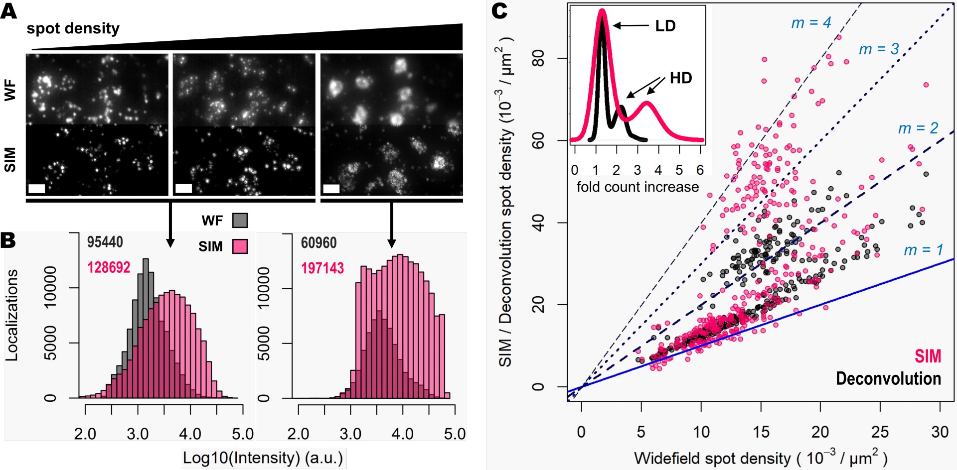 SIM 增强了对比度、分辨率并提高了斑点检测性能