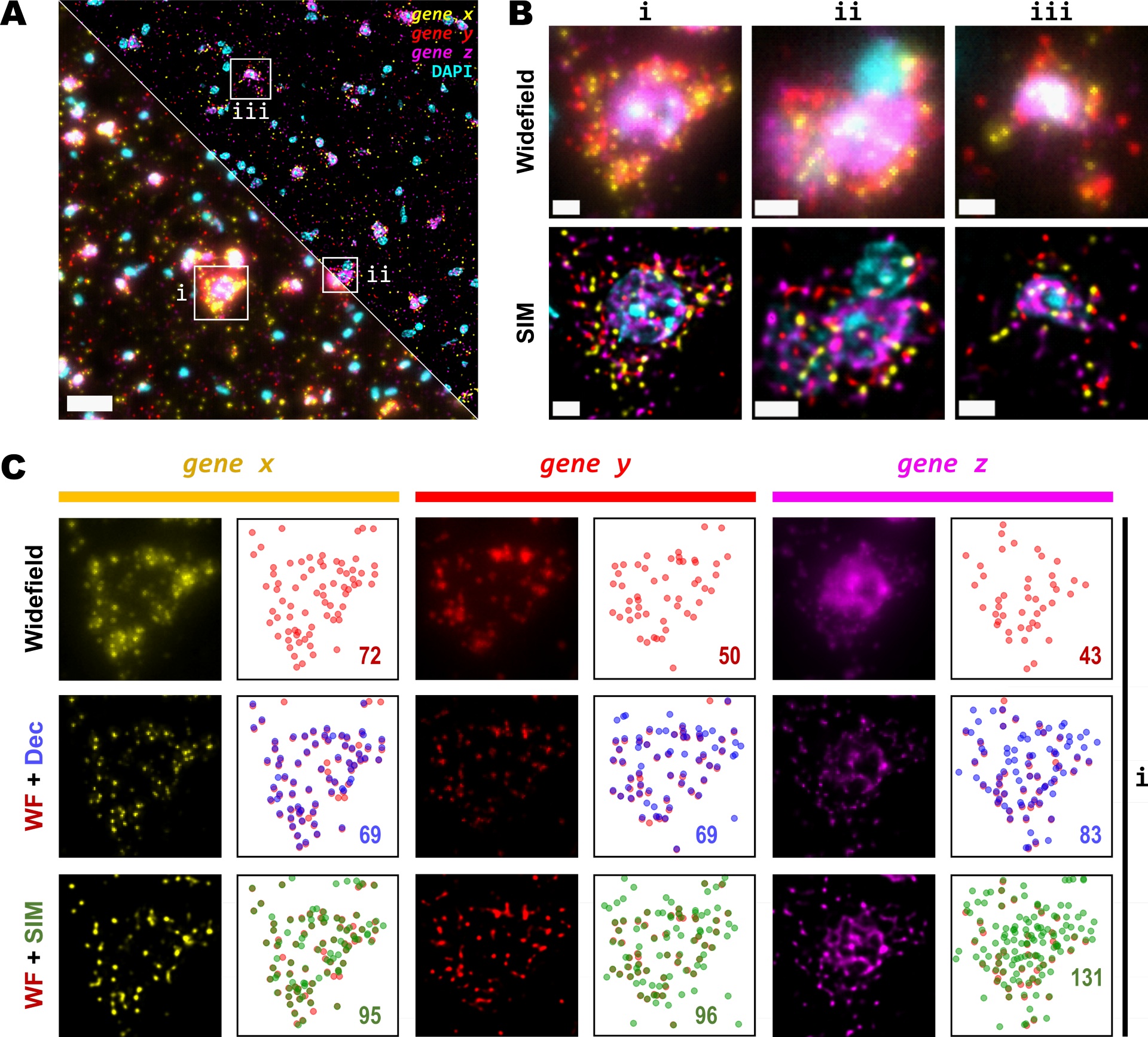 图 3: 在中等放大倍数和 NA 的超分辨图像中,RNA 斑点检测的灵敏度增加。 (A) 小鼠大脑冠状切面的单 FOV。(A)小鼠脑冠状切面的单个 FOV。 在每个通道中观察到三组 50 个基因(Cy3、Cy5 和 Cy7)。 左下角和右上角分别对应 WF 和 SIM 图像。 (B) WF(上行)和 SIM(下行)的 (A) 中的方框区域缩放视图。 (C) WF、去卷积与 SIM 图像之间每个基因通道的分辨率和对比度增加比较。 每个荧光图像旁的图显示了 WF(上行,红色)、去卷积(中间行,蓝色)和 SIM(下行,绿色)所有检测到的斑点的位置,数字表示每个通道(x 组、y 组和 z 组)的总斑点检测。 比例尺: (A) = 30 um;(B) = 5 um.。