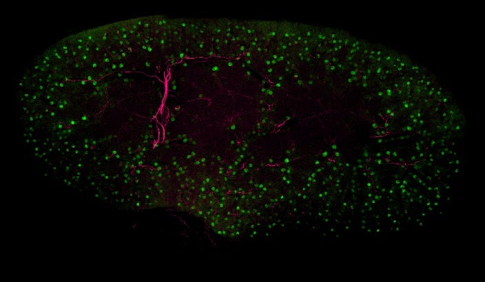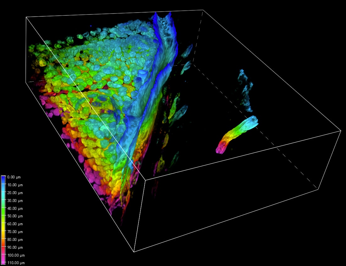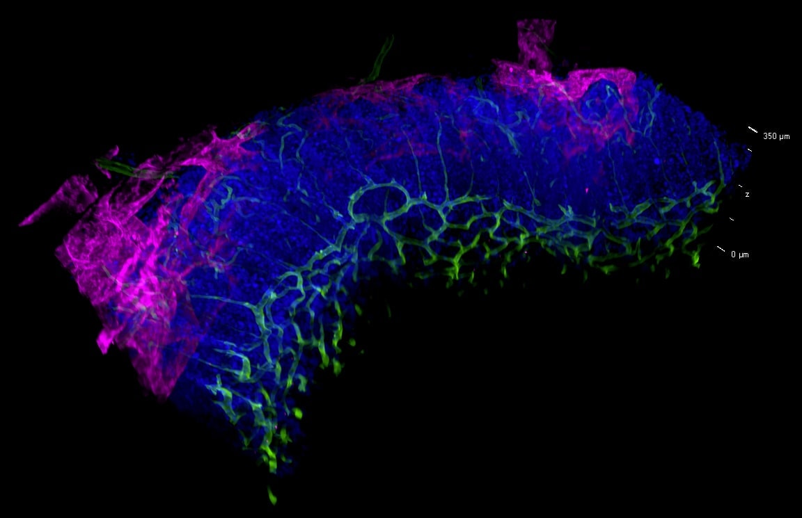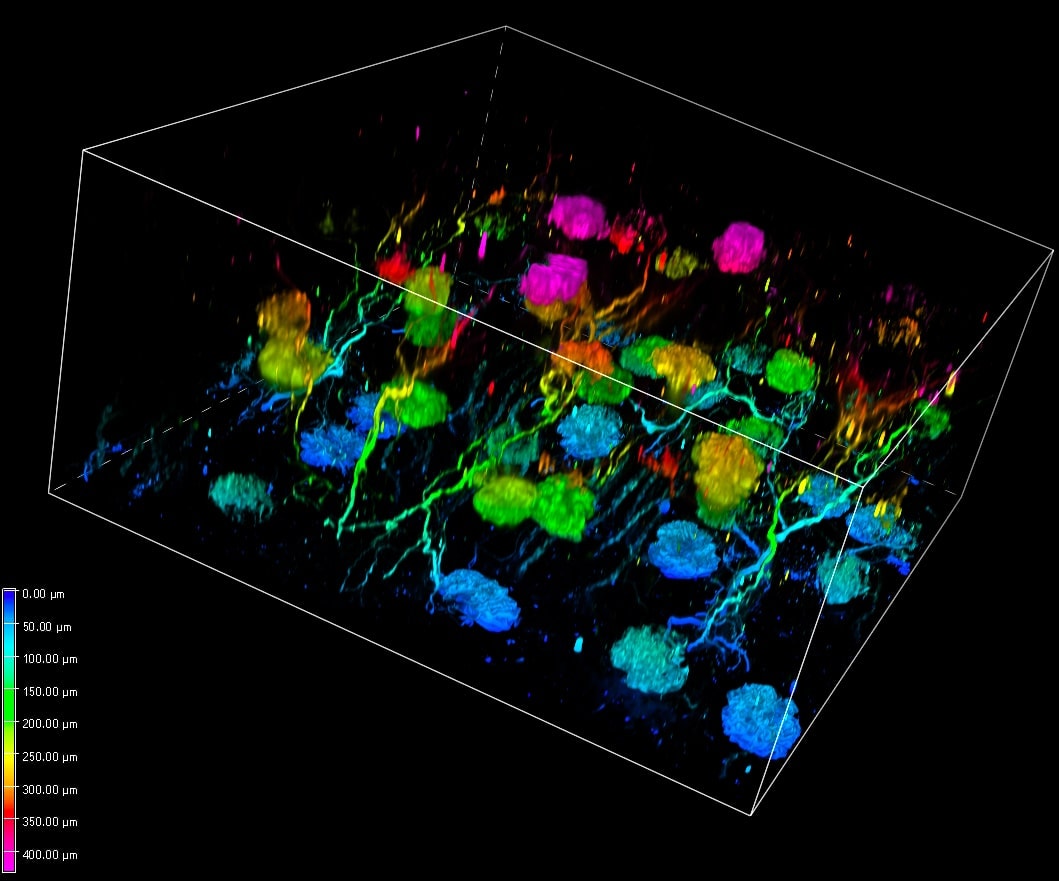 研究人员利用最新的技术比以往更深入地了解。在高端显微镜方面和新的样品制备方法上都有所提高。这里我们使用最新的V3-CrestOptics转盘共聚焦成像系统联合RapiClear组织透明剂法(click here 点击了解更多详细信息)。