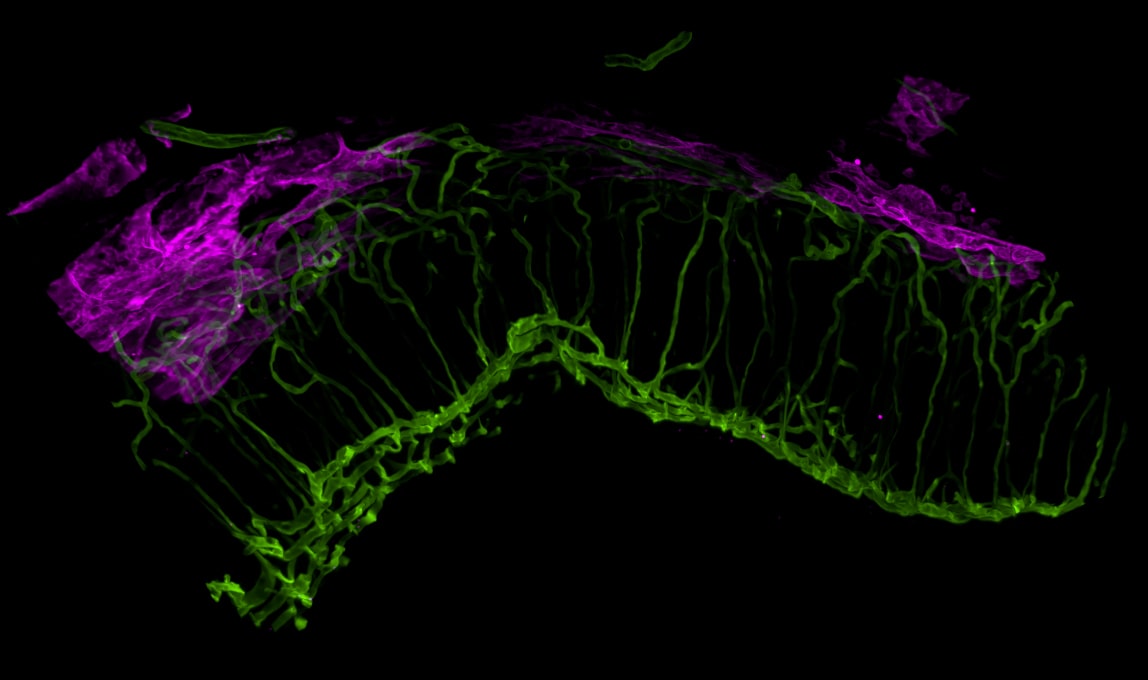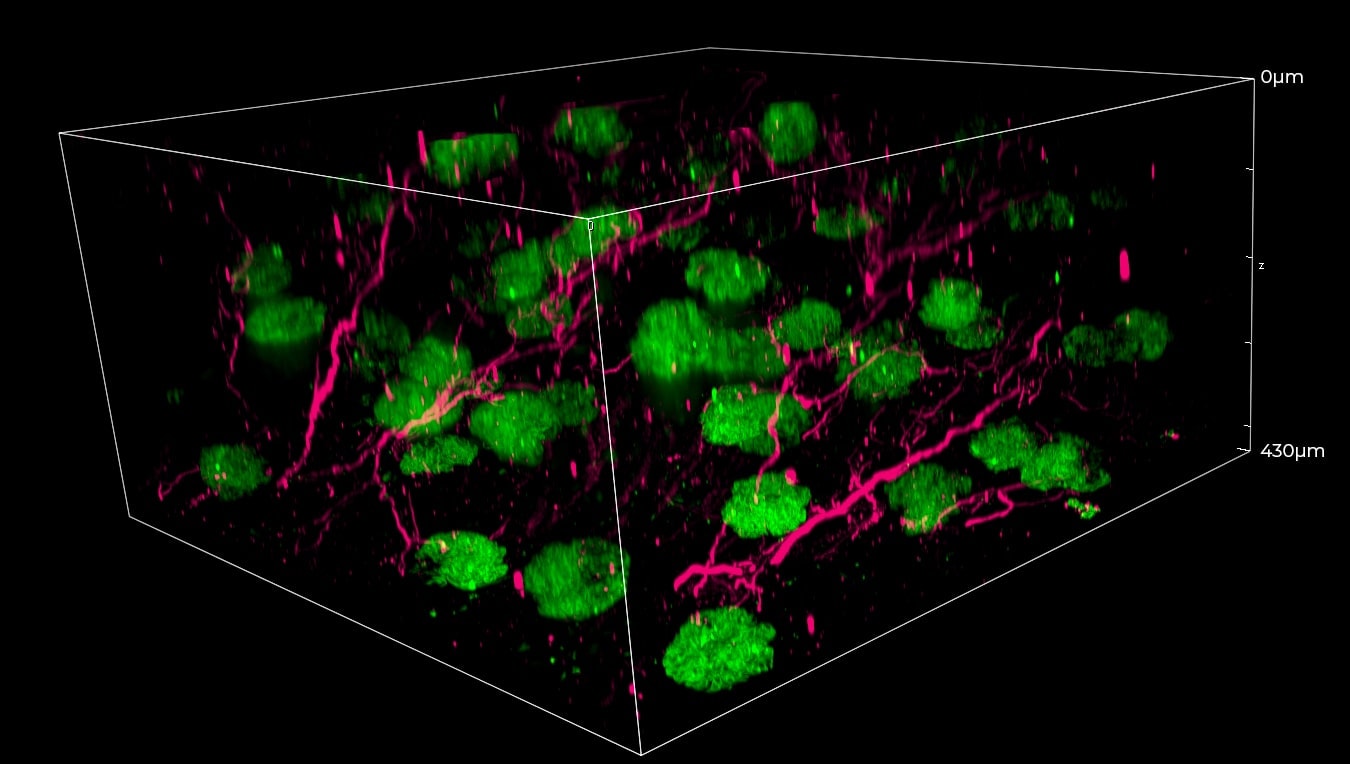 肾脏样品用Alexa Fluor 488染色标记血管(绿色),Alexa Fluor 647染色标记神经回路(洋红色)。