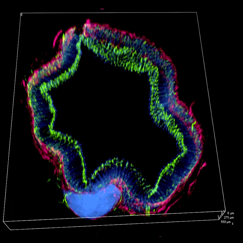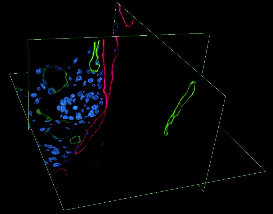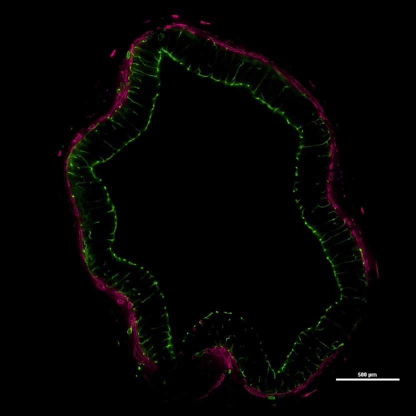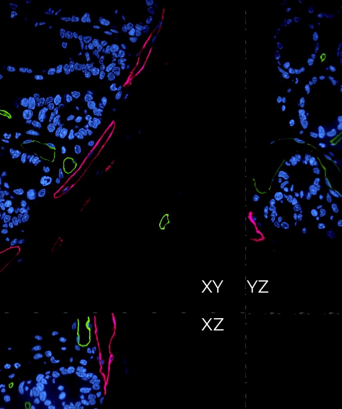 肠道样品用Alexa Fluor 488小麦胚芽凝集素染色标记血管(绿色),Alexa Fluor 633 抗LYVE1抗体染色标记淋巴管(洋红色)还有SYTOX Orange标记细胞核(蓝色)。