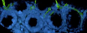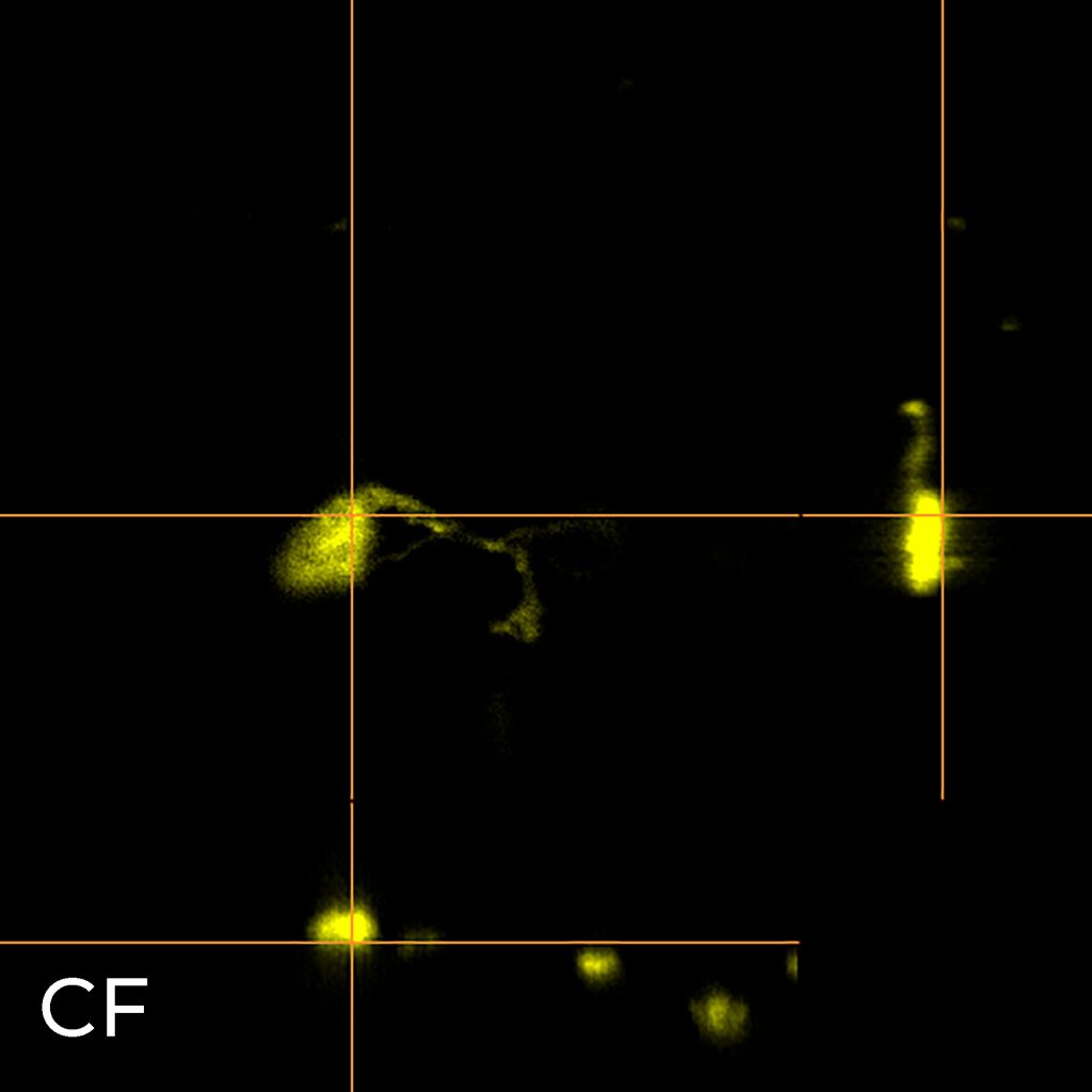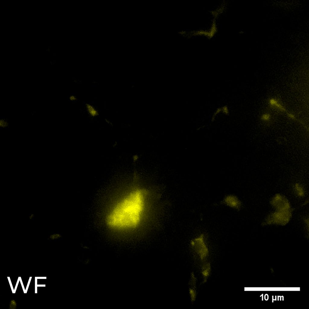 Figure 3 represents different visualization of a mouse brain (250 um thickness) with GFP-expressing microglia and, despite the presence of biological structures that inevitably create a scattering of light in an uncleared tissue, it was possible to perform acquisitions in depths comparable to those normally reached by a CF microscope, obtaining a notable increase in resolution and image quality (Figure 3A). This is nicely shown in Figure 3B and 3C where we focused on a particular microglial cell. The morphological features were observed and, thanks to the easy and fast switching between WF, CF spinning disk and SR, it was possible to enhance fine cellular structures otherwise difficult to appreciate, proposing the DeepSIM as a powerful tool for cell morphology studies.
