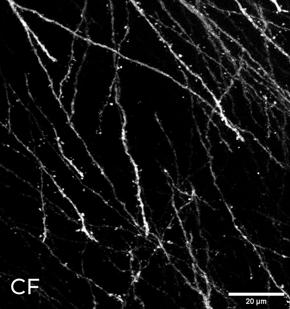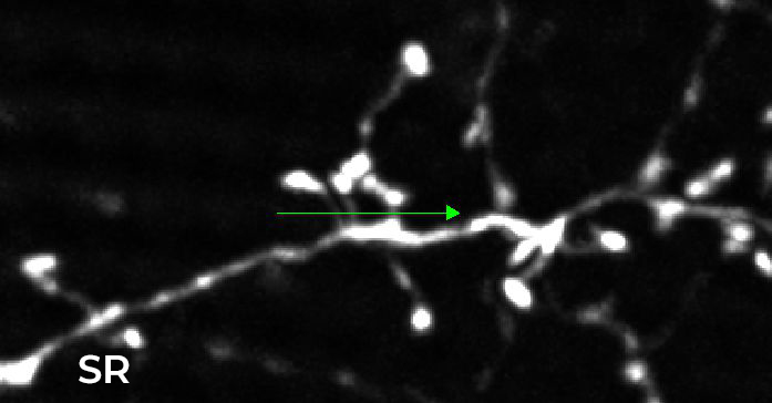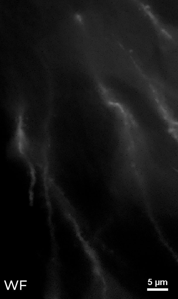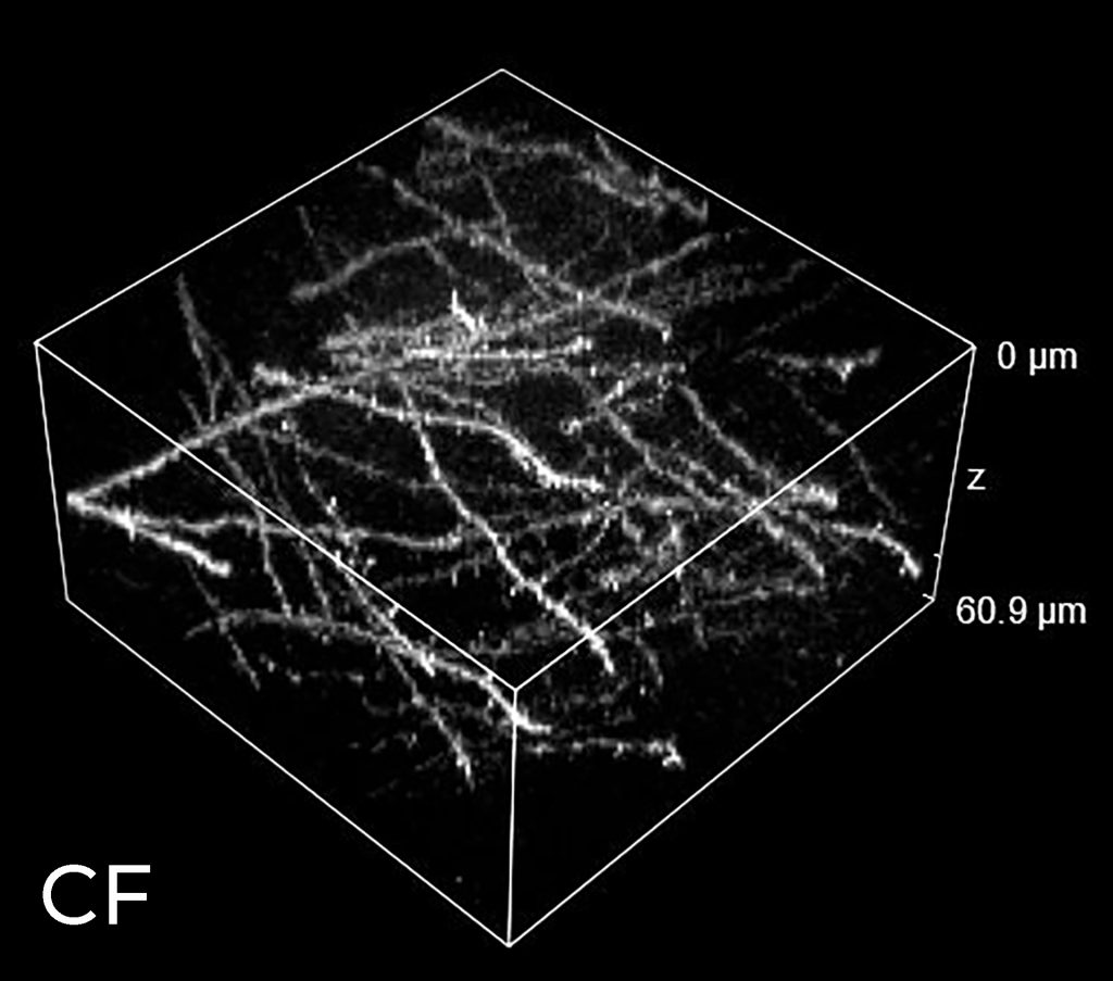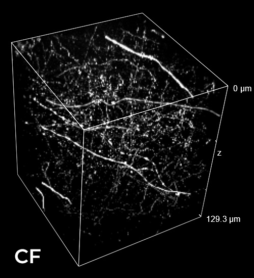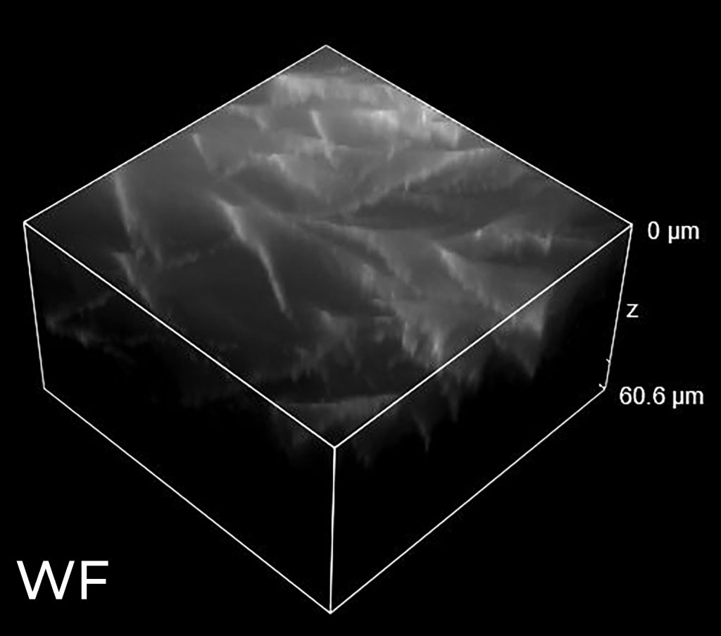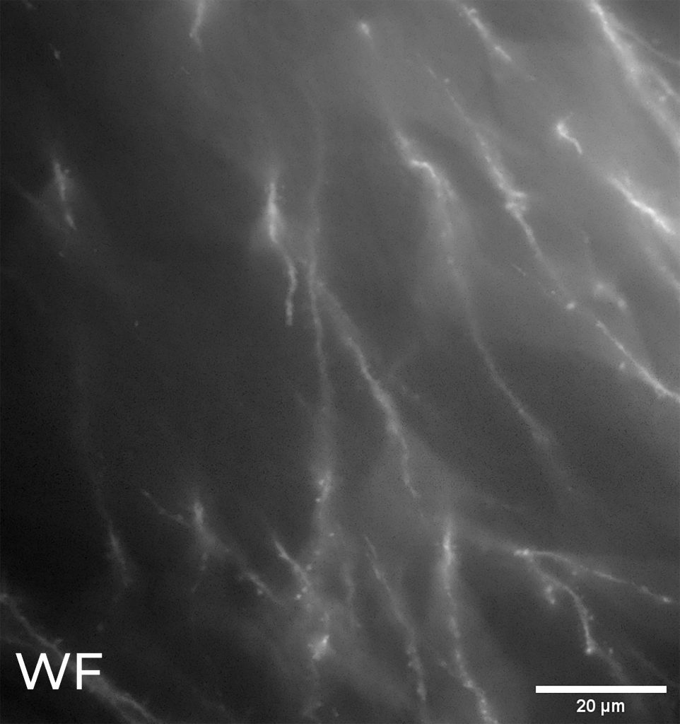 For this purpose, we tested several scattering neurobiological samples and in Figure 2 different visualizations of conventionally prepared mouse brain sample (100 um thickness) with GFP-expressing neurons are shown. In particular, we focus on dendritic spines and, as nicely reported in Figure 2A and 2B, these detailed protrusions are much more detectable and clearer in the super-resolved images compared to WF and CF spinning disk data. Moreover, the super-resolved 3D rendering of this sample (Figure 2C) demonstrates that is it possible to appreciate this nanometer-sized protrusion even 60 um deep inside the sample.