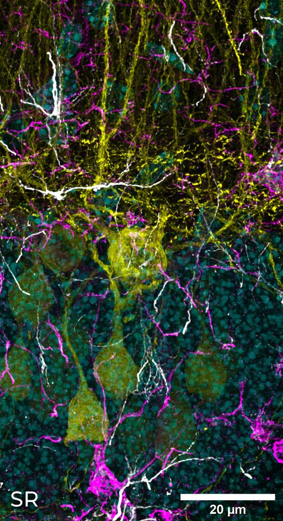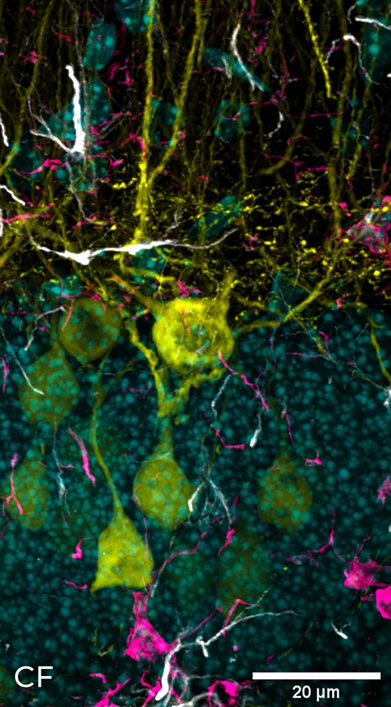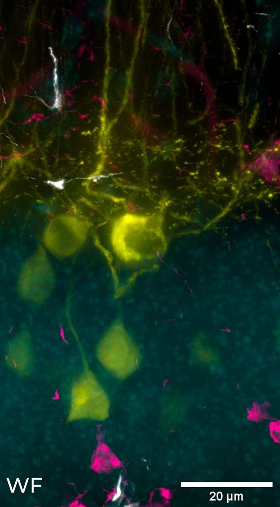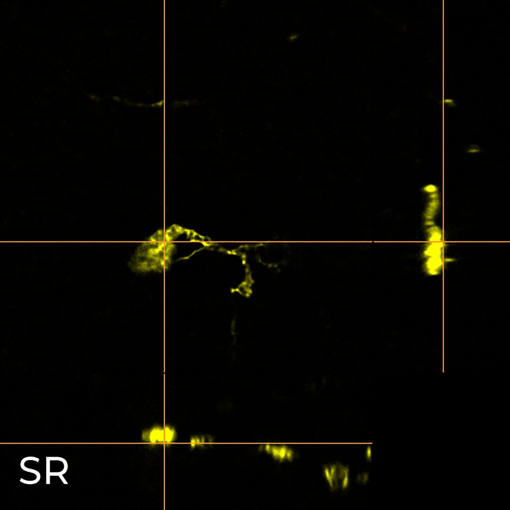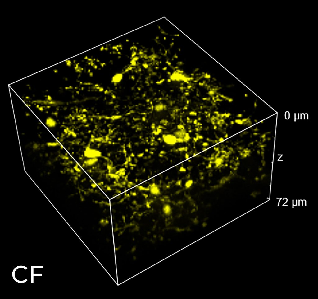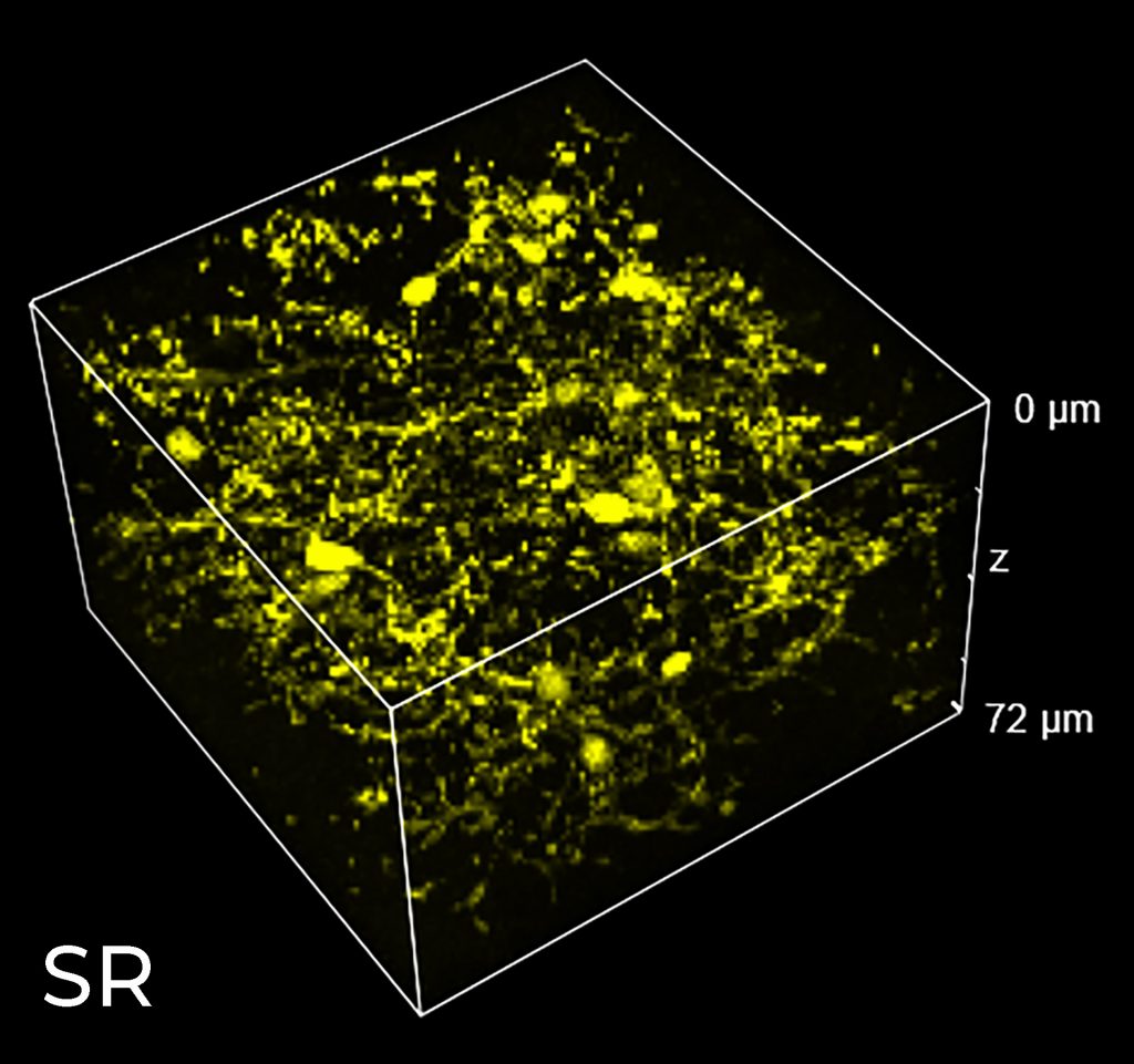 In Figure 5 a mouse brain tissue section showing neurons with dendritic spines (yellow), microglia (magenta), astrocytes (white) and DNA (cyan) is shown, in a total volume of 30 um. These images demonstrate that with DeepSIM it is possible not only to easly switch from WF to CF and SR microscopy technique, but also that fast and deep multi-color imaging of conventionally stained sample is possible with SR too. Moreover, taking advantage of the specifications of our CF spinning disk system, we can also do more and use the dual-camera function to simultaneously acquire multiple channels, speeding up the acquisitions.