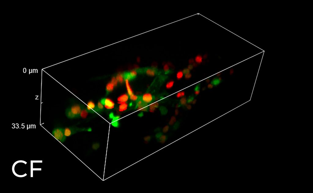 These images demonstrate that, thanks to a super-resolved optical sectioning with Z resolution up to ~ 300 nm, the DeepSIM allows the addition of a deeper level of detail to large CF acquisitions. The DeepSIM is in fact designed to work with samples of thicknesses comparable to those used with CF microscopy, giving super-resolved data over 50 µm Z depth. This means that the only limitation is given by the working distance of the objective and that more meaningful data can be obtained from native heterogeneous complex samples.